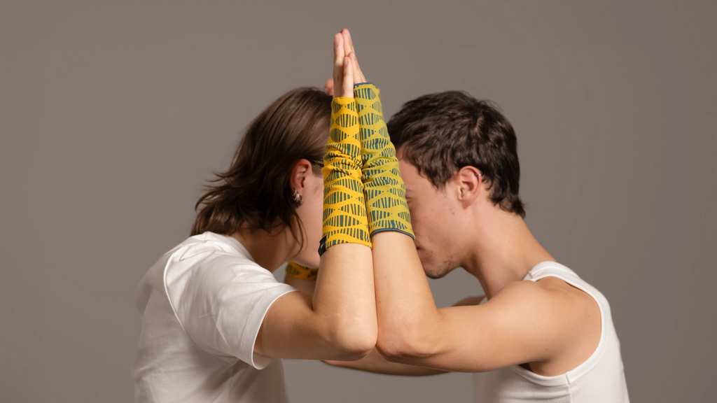 La colección de haramakis, mitones y turbantes, diseñados en exclusiva para Happy Belly Barcelona y estampados con serigrafía artesanal sobre algodón orgánico, está disponible en cuatro alegres combinaciones de color.