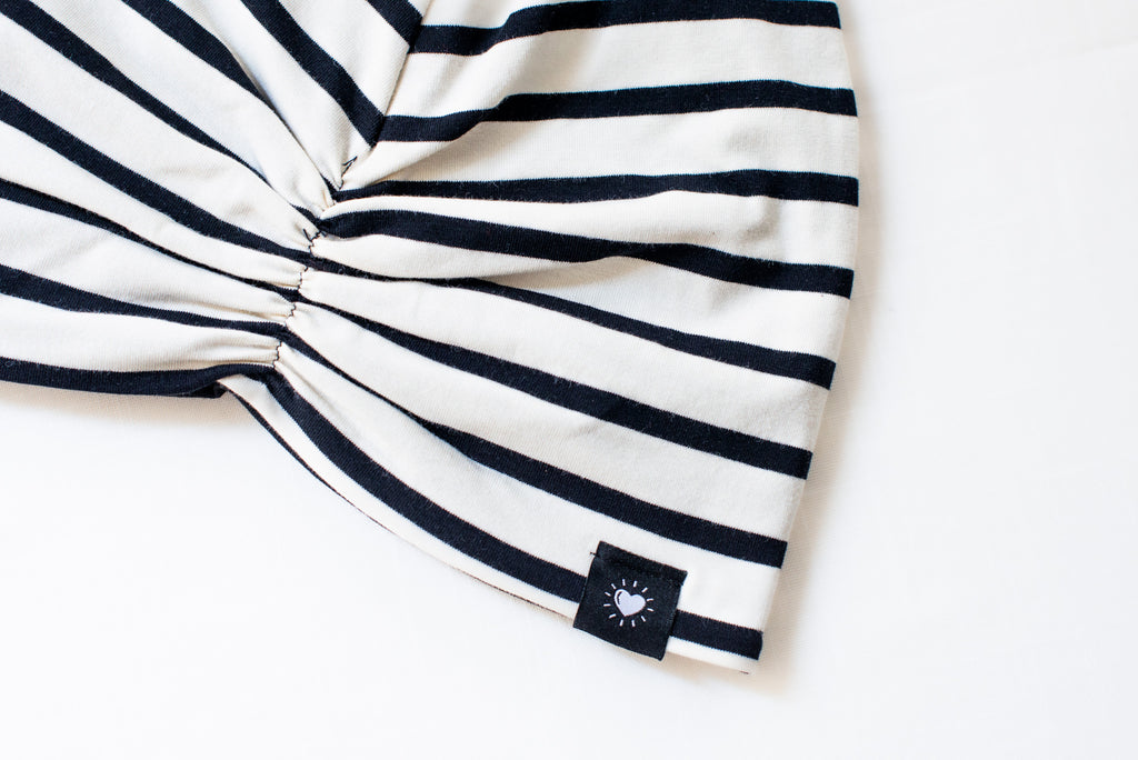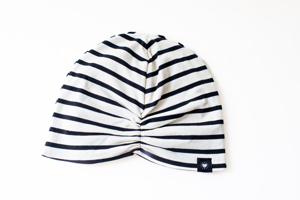 Nuestros turbantes de algodón orgánico reversibles son el accesorio perfecto para vestir con estilo y cuidar de tu salud al mismo tiempo. Confeccionados con cariño en Barcelona, este turbante de rayas negras con el interior negro, realza tu look y protege el cabello del frío y del viento, ayudando a mantener el cuero cabelludo sano. ¡Elegancia sin pasar frío!